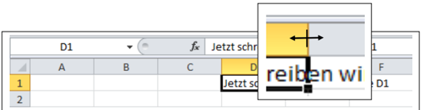 Bewegen Sie den Mauszeiger in den Zwischenraum der Spaltenköpfe von Spalte D und E -> der Mauszeiger verändert sich zu einem Doppelpfeil. Ziehen Sie mit gedrückter linker Maustaste nach rechts, damit sich die Spalte D verbreitert.