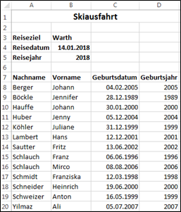 - die Zellen D8:D20, mit der aus dem Geburtsdatum das Geburtsjahr ermittelt und ausgegeben wird.