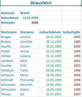 Da sich das Reisejahr aus dem Reisedatum (Zelle B4) und das jeweilige Geburtsjahr