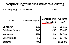 Für die Berechnung des Verpflegungskostenzuschusses wurde die abgebildete Tabelle erstellt.