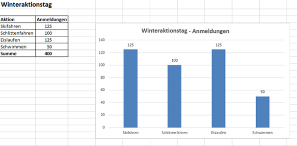 Im Vordergrung steht der ,,Größenvergleich" der einzelnen Aktionen (= Kategorien). Die einzelnen Aktionen (Kategorien) erscheinen daher in der X-Achse (=Kategorienachse) und die dazugehörenden Anmeldezahlen als Datenpunkte in der Größenachse (Y-Achse).