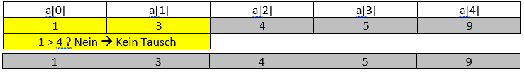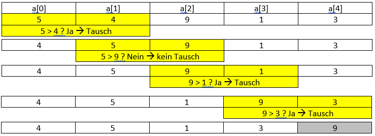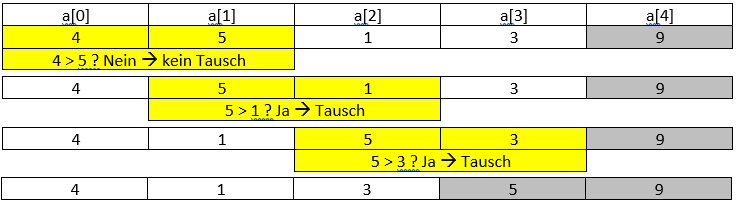 → Ende erste Bubble-Phase. Ab a[4] ist das Array sortiert.