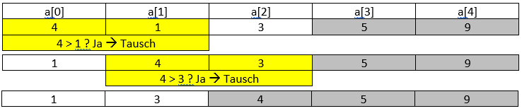 → Ende der dritten Bubble-Phase. Ab a[2] ist das Array sortiert.