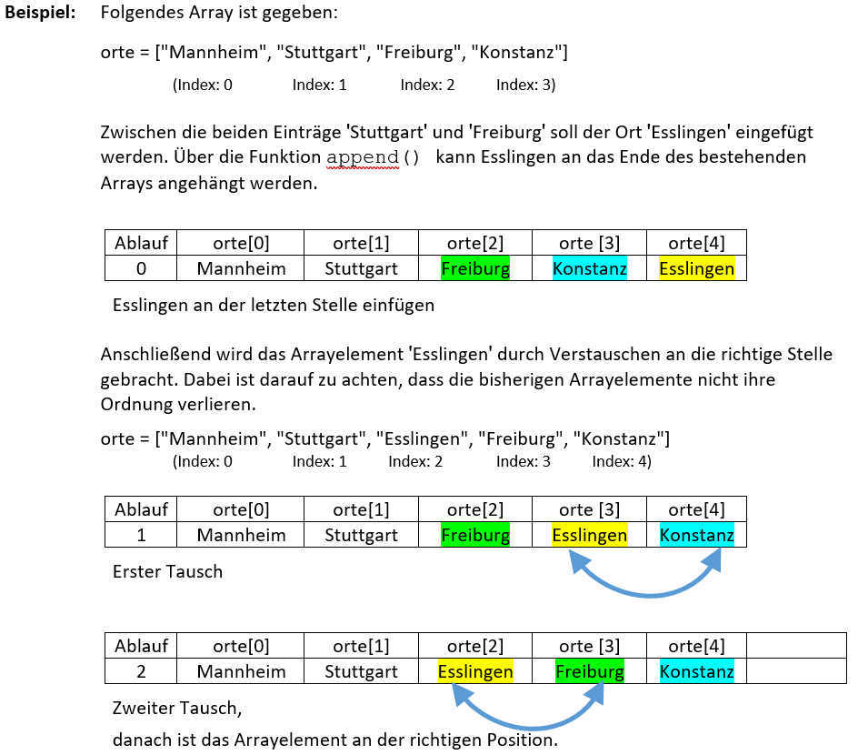 Die Position, an welcher der neue Inhalt im Array stehen soll, kann über den Index dieser Position angegeben werden. Bis zu dieser Stelle wird das neue Element Schritt für Schritt „nach vorne“ verschoben.