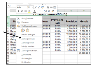 • Im Kontextmenü (rechte Maustaste) den Befehl 'Zellen einfügen' ausführen